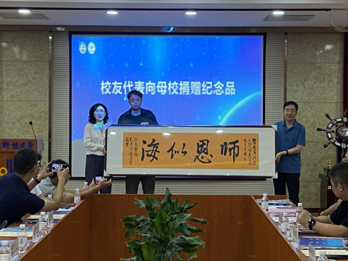 随后,青岛英通信息技术有限公司总经理刘鹏员工发言,他表示要充分发挥母校与员工之间的桥梁和纽带,凝聚员工智慧与力量,促成更多合作,为母校和公司的发展做出更大贡献。最后,员工代表向母校捐赠纪念品并合影留念。