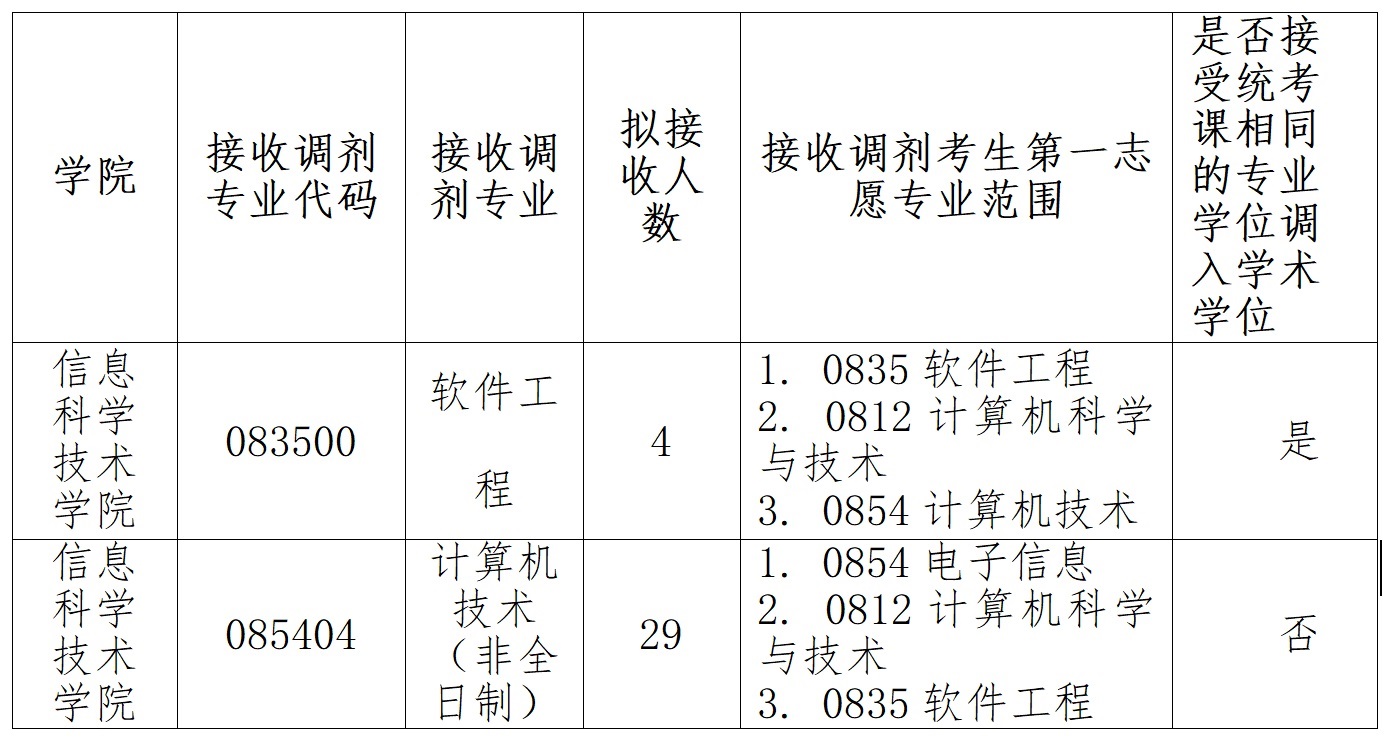 2024年,公司拟接收的调剂专业和要求如下表,其中统考科目应与调入专业全国统一命题科目相同,调剂时数学一、二和英语一、二可由高向低调剂,不可由低向高调剂,初试专业课科目与调入专业初试科目相同或相近。符合调剂报考条件的考生可登录中国研究生招生信息网:http://yz.chsi.com.cn,(以下简称“研招网”)填报信息。