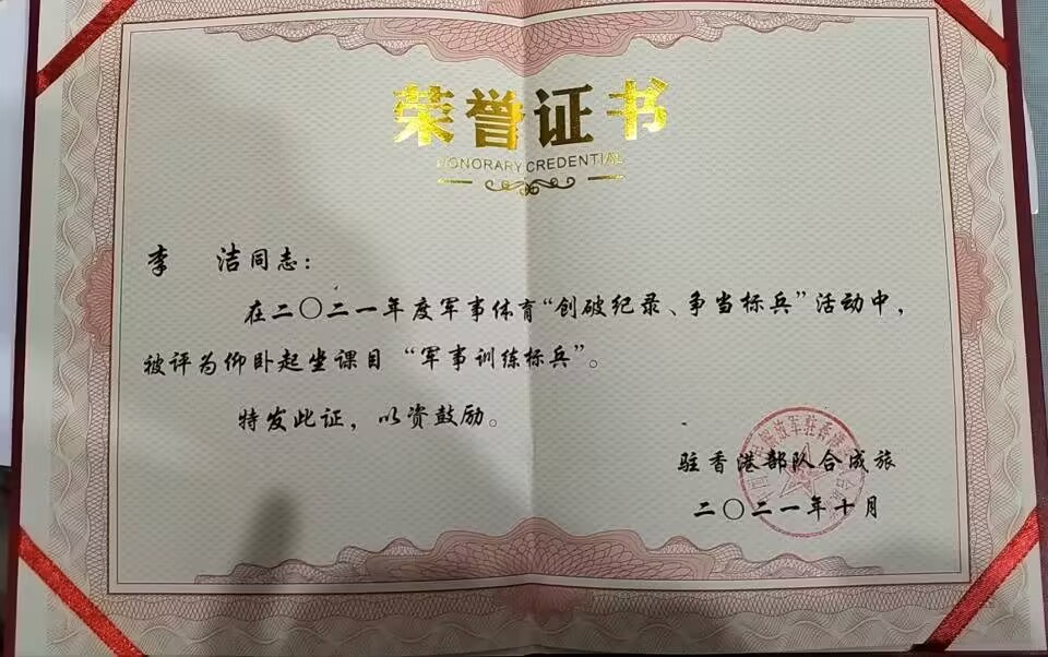 在公司的宣传和影响下,李洁进一步坚定了自己的军旅梦,毅然决定报名参军。在2020年她进入中国人民解放军驻香港部队某特战连服役。作为一名特战队员,她始终奉行练就一身真本领才是硬道理,每天刻苦训练,掌握了射击、攀登、游泳、拳术、格斗等多种军事技能,并获得了优异的成绩,在部队组织的“创破纪录、争当标兵”活动中获得“军事训练标兵”称号,军事体育训练等级达到特3级,并获得嘉奖一次。期间,她还参加了香港陆海空三军多兵种出动实战演练、青山演习、香港维稳制乱红蓝对抗等大型军事活动,培养了她坚韧不拔、勇往直前的品质。