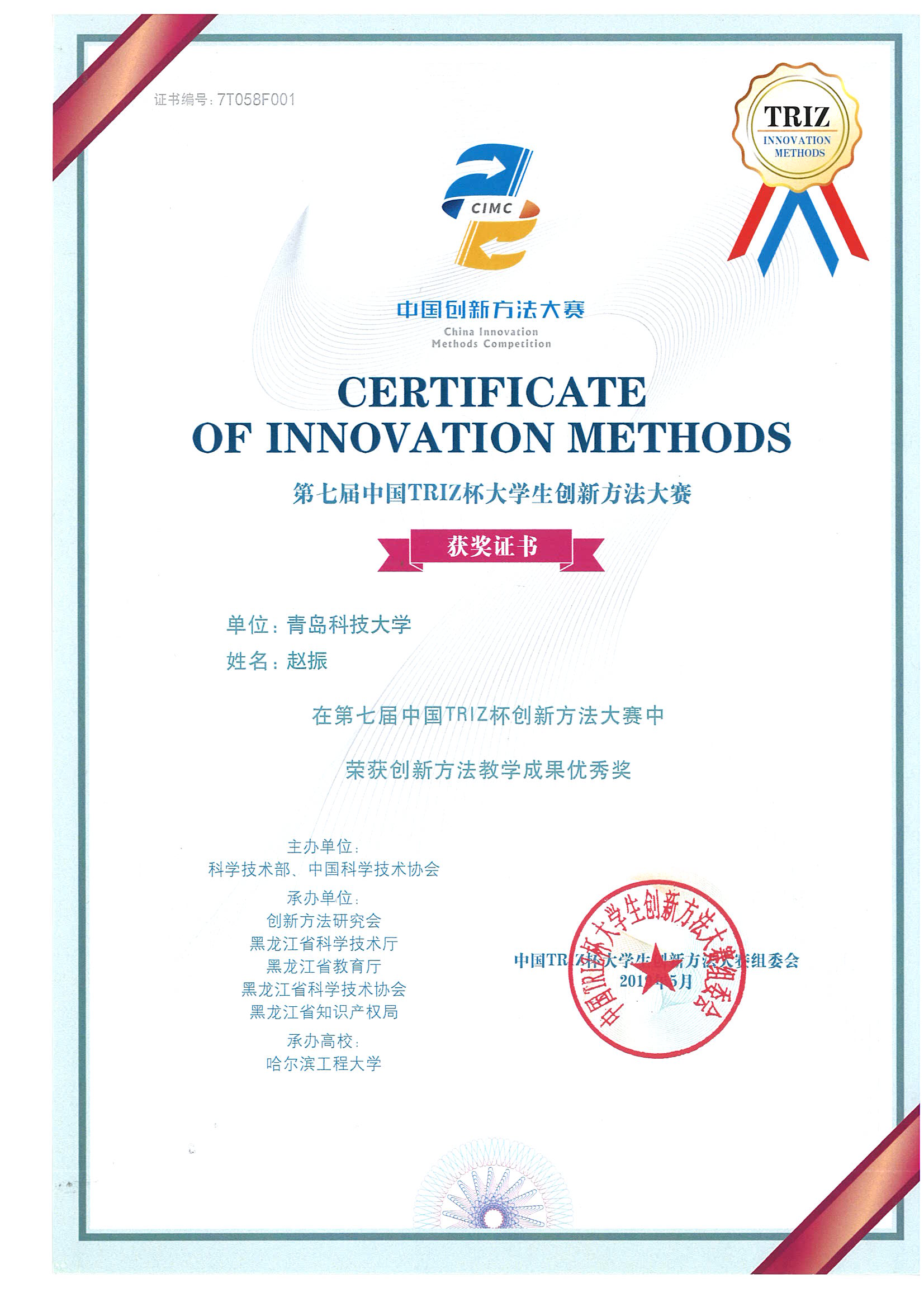 43、教师获奖--第七届中国TRIZ杯创新方法大赛创新方法教学成果优秀奖