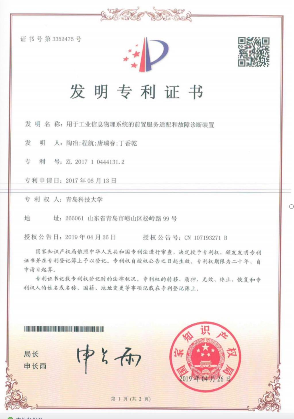 1、发明专利--用于工业信息物理系统的前置服务适配和故障诊断装置