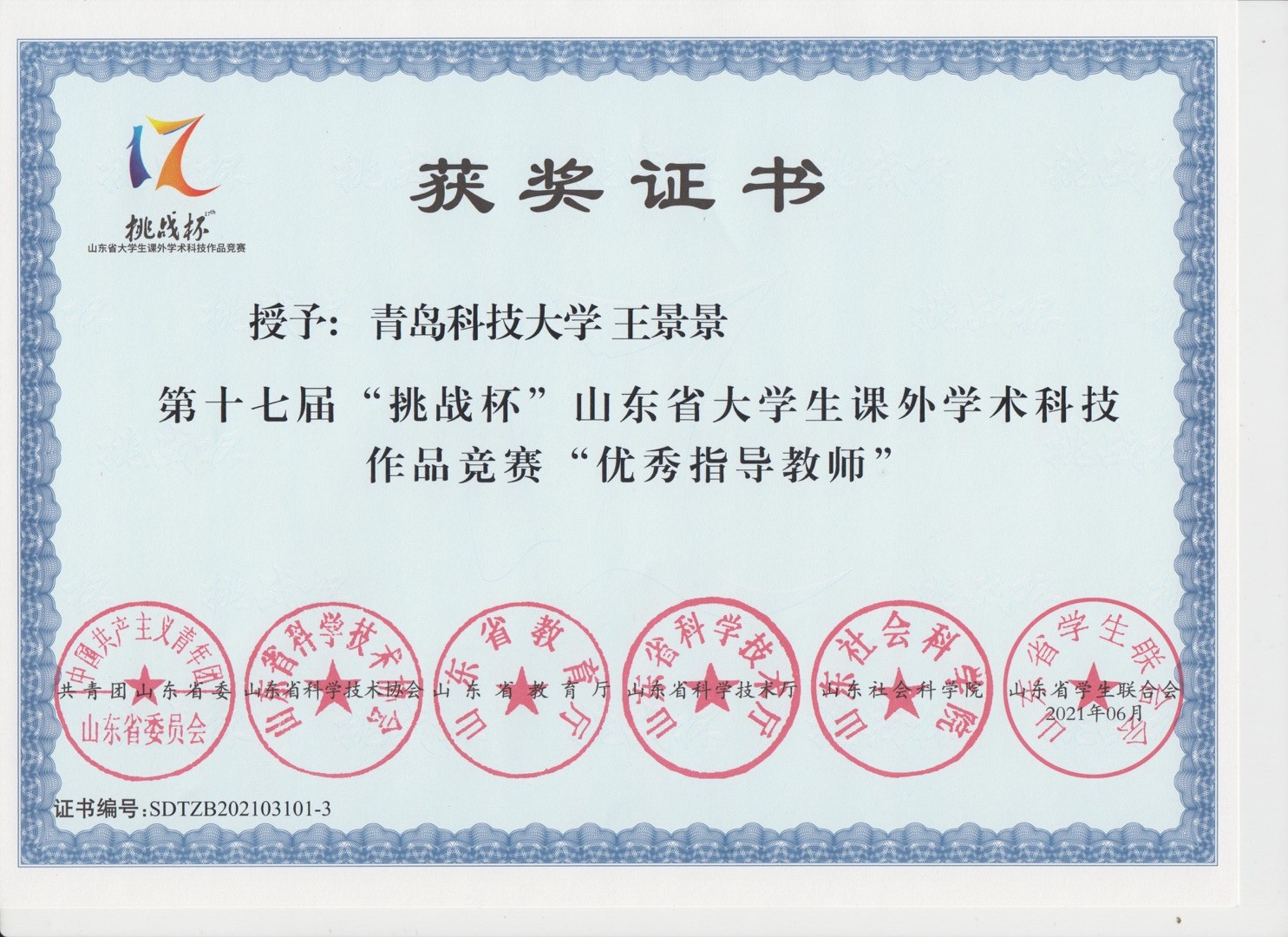 42、教师获奖--第十七届挑战杯山东省老员工课外学术科技作品竞赛优秀指导教师