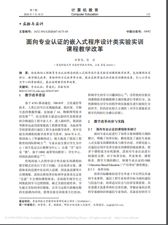 29、教研论文--面向专业认证的嵌入式程序设计类实验实训课程教学改革